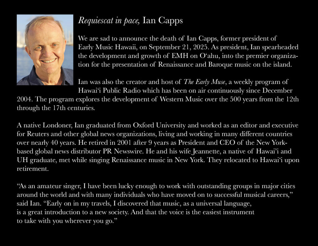 Early Music Hawaii is a nonprofit organization established to promote the performance and enjoyment of Medieval, Renaissance and Baroque music in our Islands, and to explore historical performance practices.